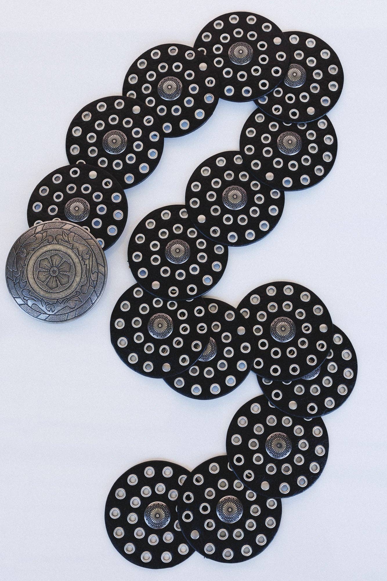 Turn heads with this silver and leather belt that looks perfect with flowy maxi dresses and skirts.